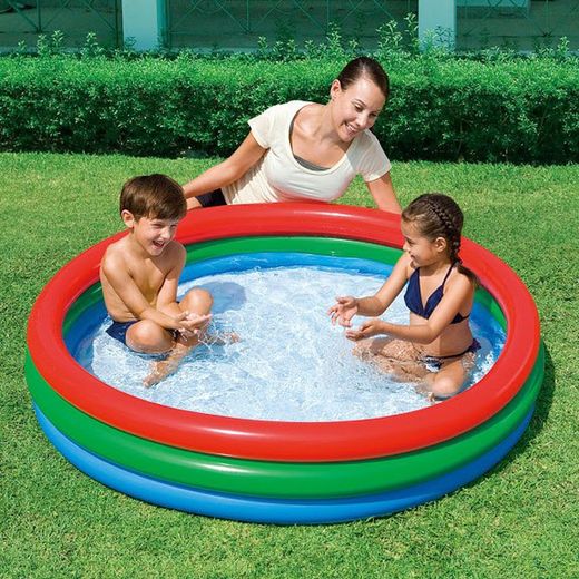 Inflatable pool for over 3 years Measures: 102x25cm 3 separate rings soft inflatable floor Repair patch Water capacity: 110L Vinyl: 0.19mm